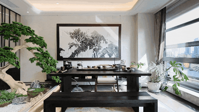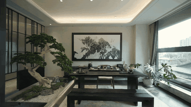 进入到会客空间,大面玻璃窗取金属线条的使用,空间更为通透轻巧,取玄关的沉稳构成较着反差,但正在灰色的温士顿石材地面过渡下,丝毫不高耸。私密空间则由一道移门进行分隔,移门把手采用中式保守的敲铜工艺,每一条复杂的纹取凹凸,均由纯手工频频镪打而成。虽然只是点滴细节,也起到了强化新中式内核的大感化。![]()
