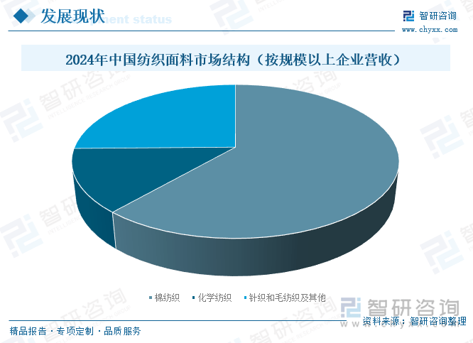 自人类社会降生之初,纺织品就取人们的糊口慎密相连。其成长过程反映了人类科技、艺术、文化和经济的前进。最早的纺织品呈现正在新石器时代,人们用动物外相和动物纤维手工编织。跟着农业的成长,棉花、羊毛和丝绸等天然纤维起头被普遍使用。工业期间,机械纺织手艺的降生极大地提高了纺织品的出产效率和质量,鞭策了大规模工业出产的成长。正在这个期间,棉花成为最主要的纺织原料,催生了以棉纺织为代表的第一次工业。20世纪初,人制纤维和合成纤维的发现如尼龙和涤纶,进一步丰硕了纺织品的品种和使用。这些新材料具有优秀的机能和普遍的合用性,大大拓宽了纺织品的使用范畴。进入21世纪,纺织面料的成长面对新的挑和和机缘。一方面,环保和可持续成长的正正在对纺织业发生深远影响,如绿色纺织、生物降解纤维等;另一方面,纳米纺织、智能纺织等新材料和新手艺的不竭出现为纺织面料的成长打开了新的可能性。棉纺织行业是我国纺织工业的根本性行业。它的成长不只对印染、色织、针织、复制、服拆等浩繁相关的纺织行业风雨同舟,对国计平易近生也至关主要。据统计,2024年我国棉纺织行业停业务收入11418。58亿元。 我国是名副其实的当当代界纺织面料加工场,出产配套系统完整。据统计,2024年中国棉纺织行业规模以上工业企业营收规模占纺织行业的61。40%;化学纺织行业营收占13。33%。