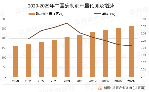 跟着全球生物手艺的不竭前进、消费者健康环保认识的日益加强以及各行业对高效出产需求的持续提拔,酶制剂市场近年来呈现出稳健的增加态势。2024年,中国酶制剂产量为207。4万吨,将来正在政策支撑以及手艺立异的驱动下,酶制剂市场将会持续增加,估计2029年酶制剂产量将增加至265。7万吨,年复合增加率为5。1%。