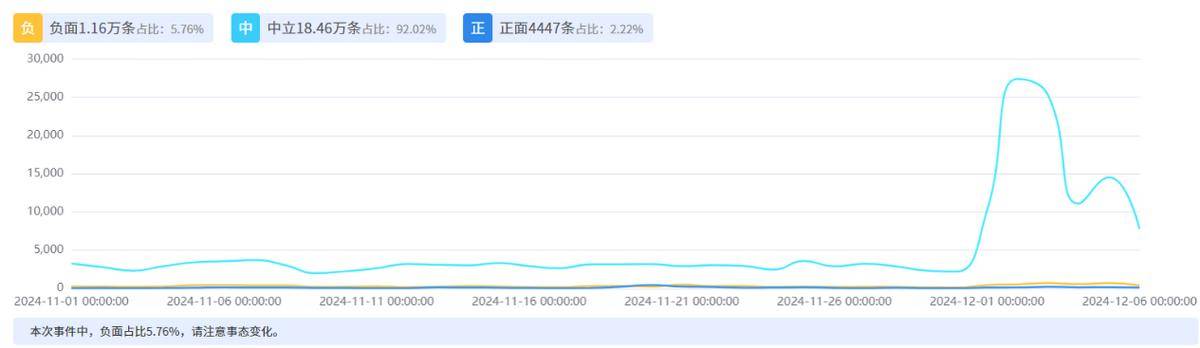 本次事务中,负面旧事1。16万条,占比5。76%,中立旧事18。46万条,占比92。02%,反面旧事4447条,占比2。22%。