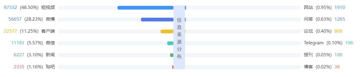 舆情数据分布:次要分布于短视频端。此中短视频端99948篇次占比49。83%,其次顺次为微博端55916篇次占比27。88%、客户端22334篇次占比11。13%、微信端12798篇次占比6。38%、旧事端5266篇次占比2。63%、网坐端1845篇次占比0。92%、Telegram端1537篇次占比0。77%、贴吧端354篇次占比0。18%。