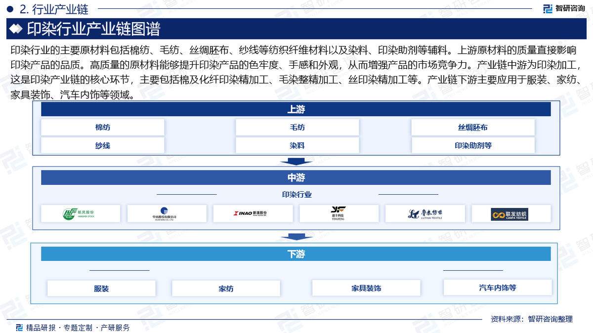 印染行业的次要原材料包罗棉纺、毛纺、丝绸胚布、纱线等纺织纤维材料以及染料、印染帮剂等辅料。高质量的原材料可以或许提拔印染产物的色牢度、手感和外不雅,从而加强产物的市场所作力。财产链中逛为印染加工,这是印染财产链的焦点环节,次要包罗棉及化纤印染精加工、毛染整精加工、丝印染精加工等。财产链下逛次要使用于服拆、家纺、家具粉饰、汽车内饰等范畴。