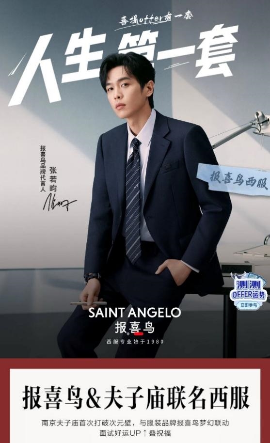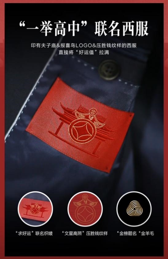 本款西服由国内出名服饰品牌报喜鸟和南庙配合打制。此中,报喜鸟的品牌名称本就具有“传送喜信”之意,而南京秦淮河畔的夫子庙被誉为“中国四大文庙”之一,是古代学子祈求成功的主要场合。此次报喜鸟为西服出格设想了内兜图案,融合品牌logo、夫子庙和“压胜钱”元素。此中的“压胜钱”是古代学子必备的祈福货币,承载着学子们“连中三元”“一品当朝”的夸姣心愿。 此次两边初次开展跨界合做,将富有夸姣寄意的保守意象取现代服饰巧妙连系,配合为消费者带来好运的质量正拆。通过将含有“压胜钱”元素的图案绣正在西服内兜上,报喜鸟但愿能帮帮穿戴者加强感,从而为求职取面试好运。