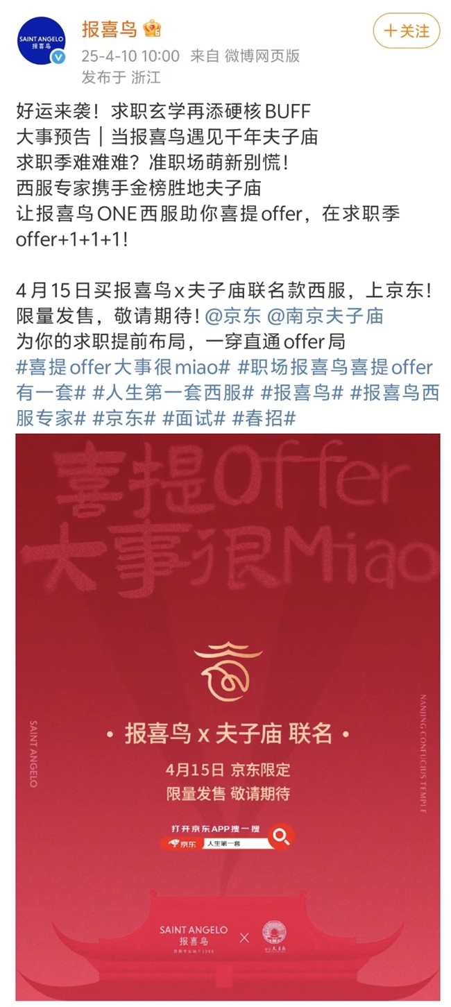 跟着服饰大牌不竭的入驻和新品上新数量的高速增加,京东服饰已成为一线服饰品牌商家新品首发的主要阵地。此次专供款西服后,京东服饰取报喜鸟将继续阐扬各自资本劣势,以更多元化的合做模式,联袂为消费者带来更丰硕、更具个性化的高质量服饰。此外,京东服饰也将为更多品牌合做伙伴供给更大增加空间,带来健康、高质量成长。(免责声明:此文内容为本网坐转载资讯,仅代表做者小我概念,取本网无关。所涉内容不形成投资、消费,仅供读者参考,并请自行核实相关内容。)临近结业季,各大高校应届生送来求职环节期。4月15日,报喜鸟×夫子庙西服即将正式上线,并于京东服饰独家首发。旨正在为有求职、面试等需求的消费者带来好运。