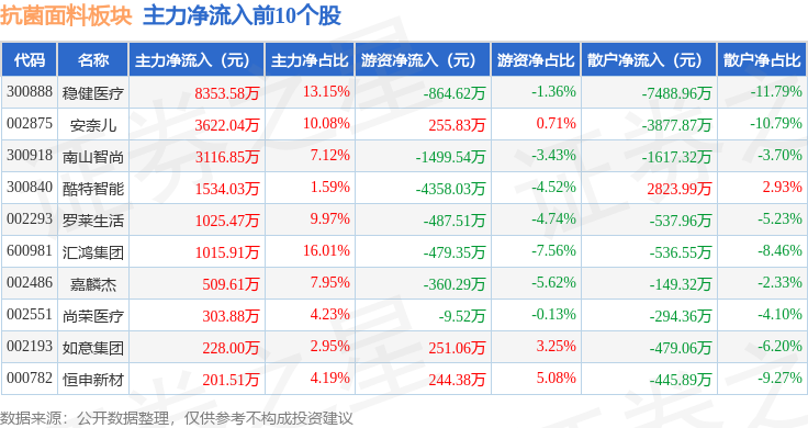 从资金流向上来看,当日抗菌面料板块从力资金净流入1。28亿元,散户资金净流出8231。3万元。抗菌面料板块个股资金流向见下表: